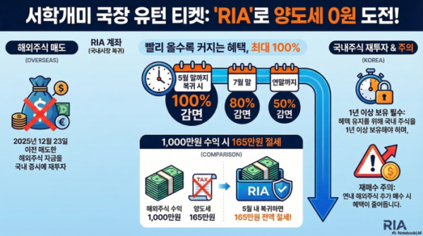 - 핵심 조건: 반드시 RIA 전용계좌에서 매도 → 원화 환전 → 국내주식 매수 → 1년 이상 보유 순서 준수