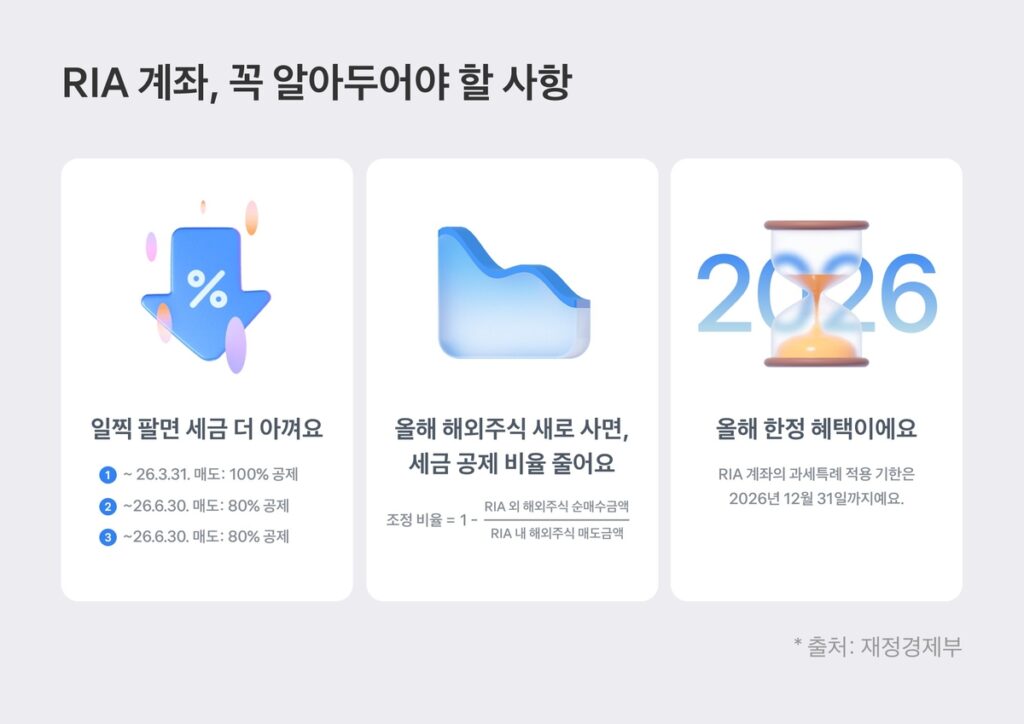 - RIA 계좌란: 해외주식 팔고 국내 주식에 1년 이상 재투자 시 양도세를 최대 100% 감면해주는 2026년 한시 제도